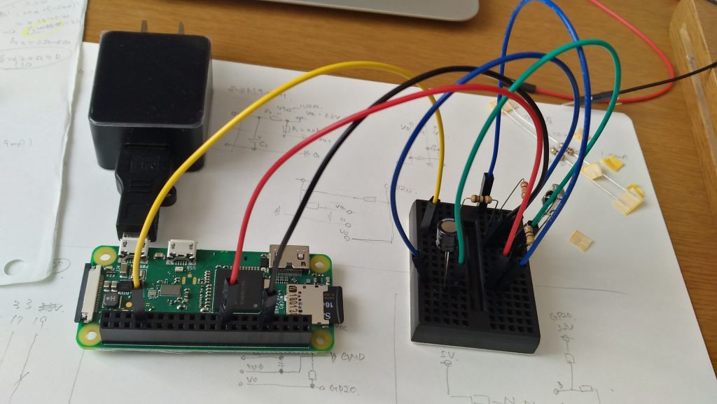 はんだ付けが完了したらブレッドボードに突き刺して以下のようにRaspberry Piへ接続します。