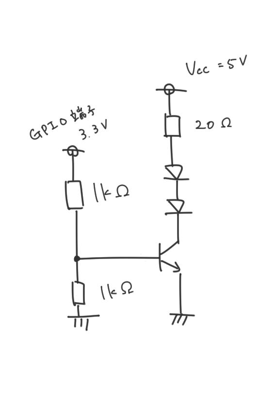 というわけでトランジスタを使ったドライバ回路を組んでGPIO出力ピンにはスイッチ用の電流を流してもらいます。