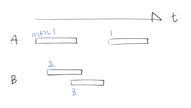 音源Aは独立して再生されるため共通のハンドルを使い回すことができますが、音源Bは重複して再生されるため単一のハンドルでは足りません。