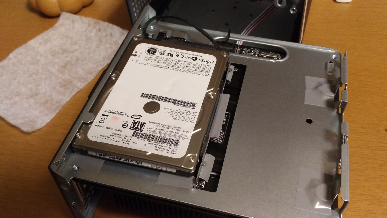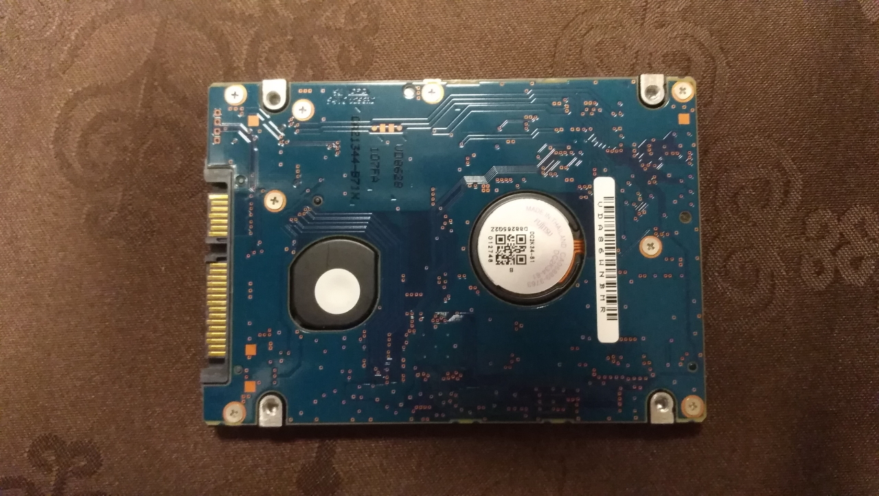 今回はノートパソコンから取り出した下の写真の2.5インチHDDを流用するわけですが、基板剥き出しのまま装着するとショートして死ぬという口コミがあったのでこれを参考に絶縁処理をすることに。