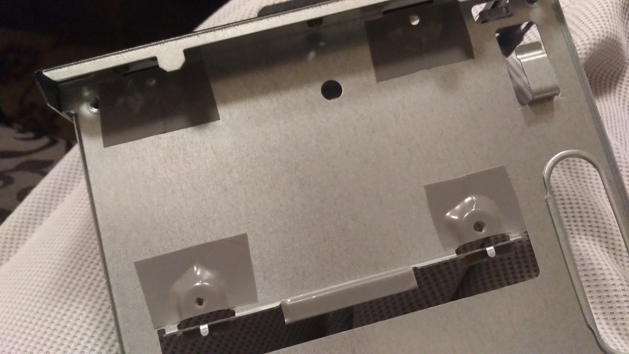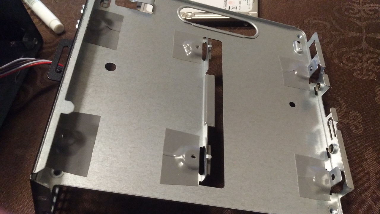 まずはネジ止め用にプレスされて突き出ている部分、次にHDDを支えているシャーシ部分にテープを巻き付けます。