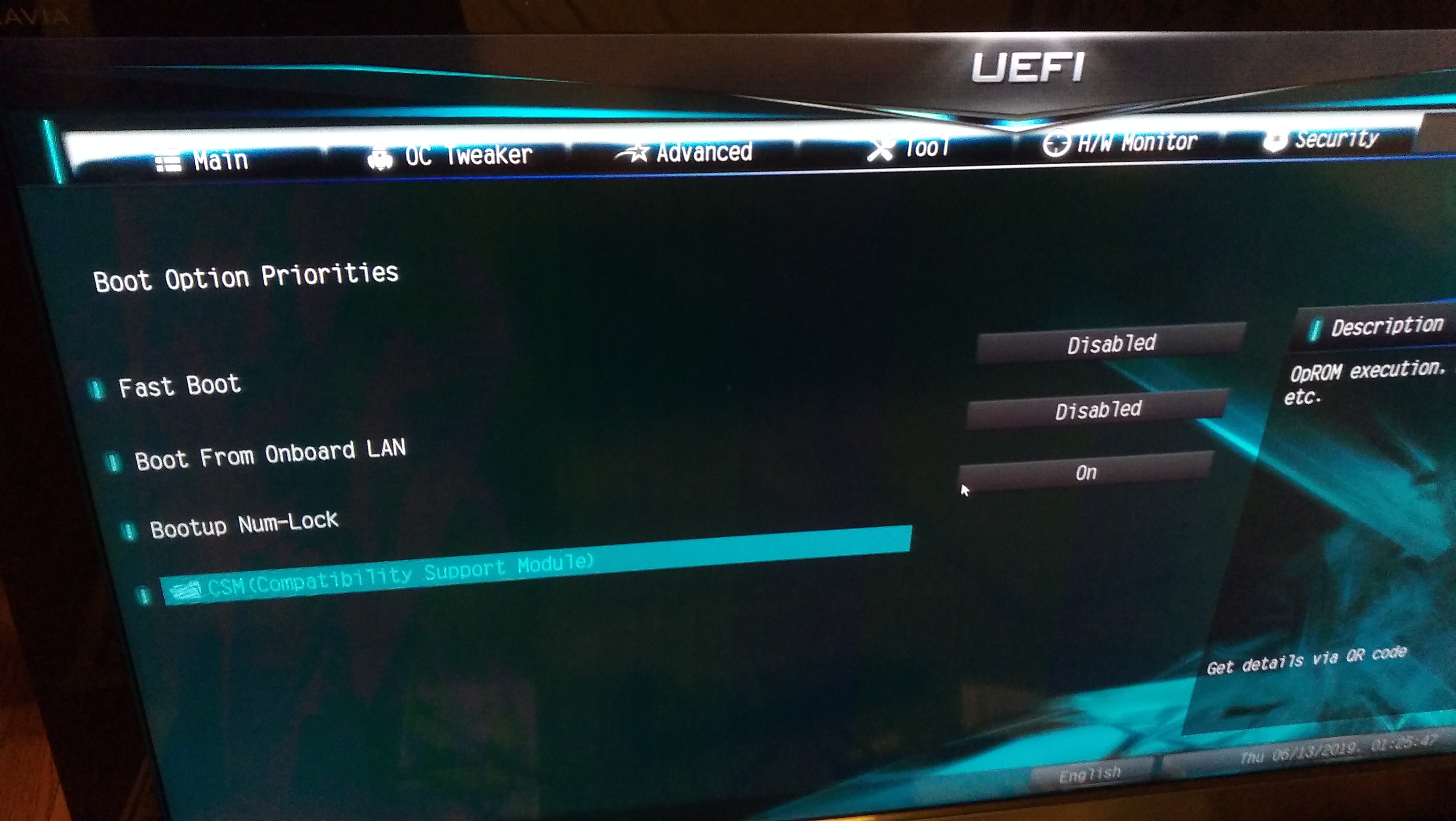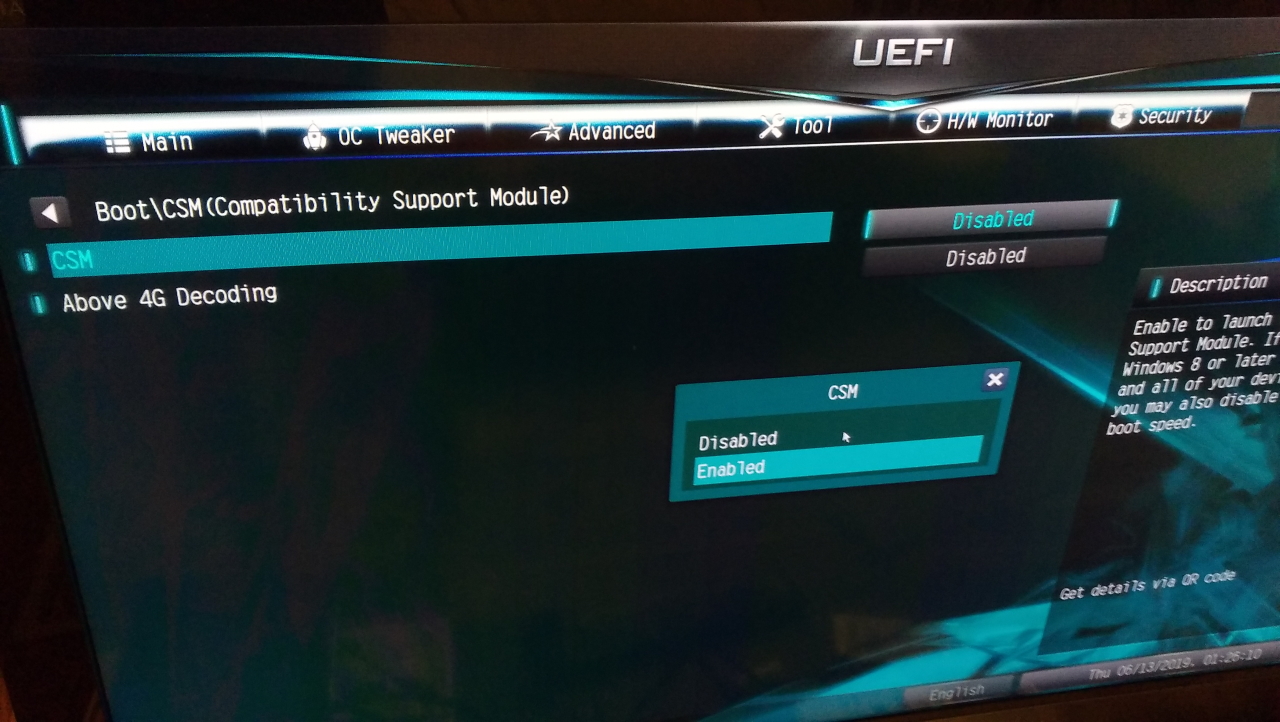CSMはその名の通りUEFIに対応していないレガシーなBIOSをサポートする機能で、有効になっていないと今回の場合はブートできません。