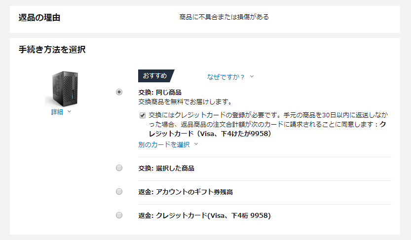 手続きに同じ商品との交換を選択し、手元の商品を返品する宣言をします。