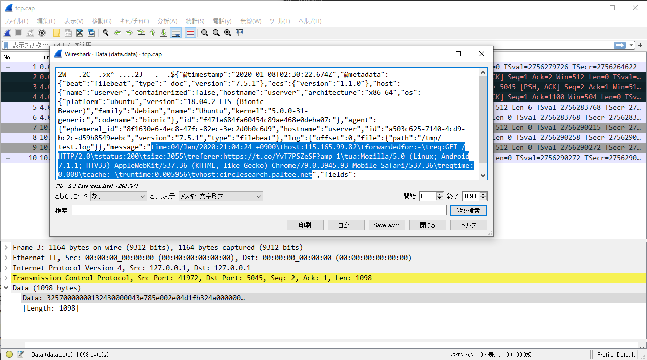 なんということでしょう。Filebeatの手によって送られるログデータが丸見えとなっています。