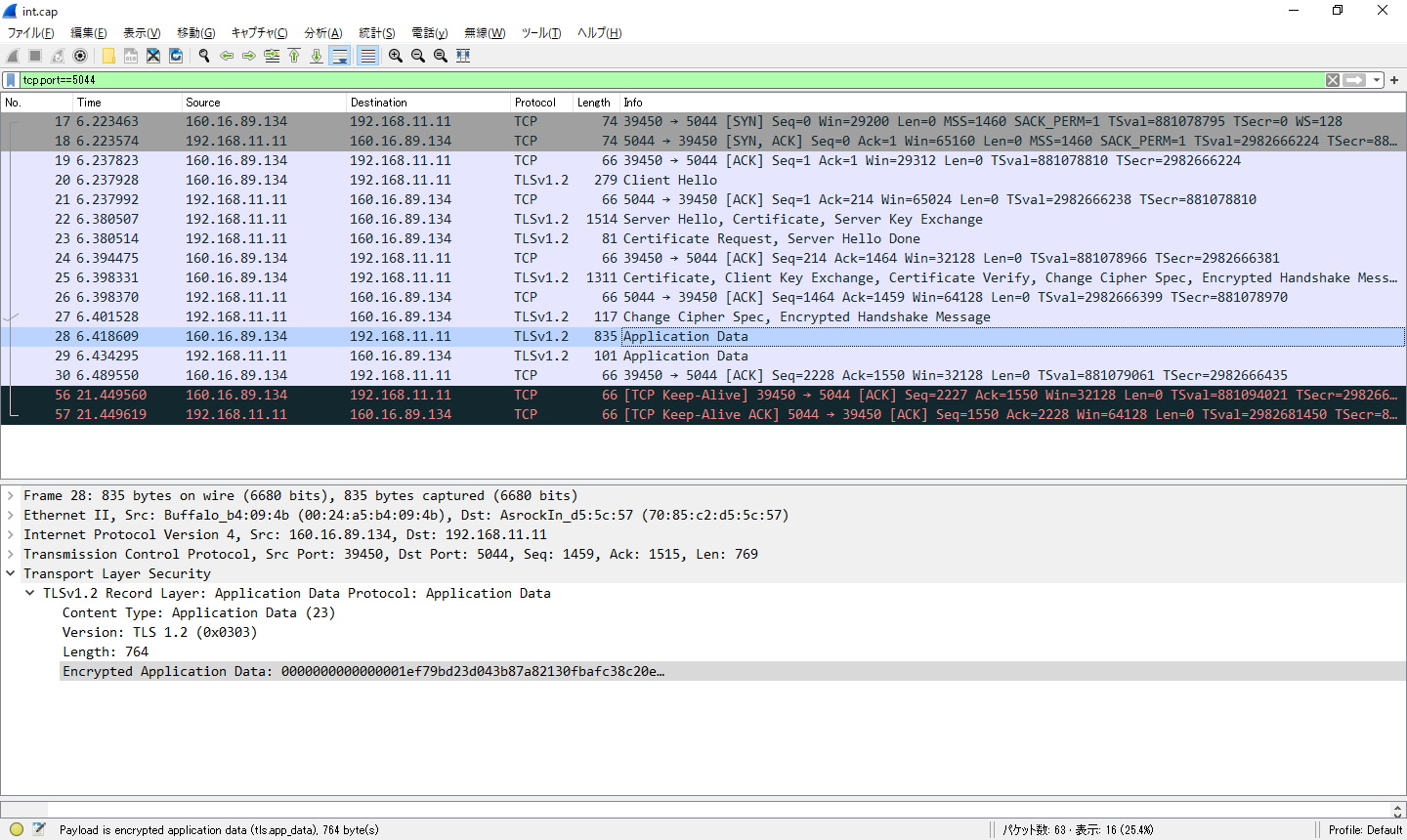 パケットをキャプチャしてもTLSで通信が行われていることがわかります。