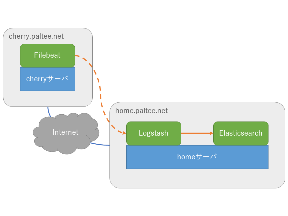 今回はVPS(以後cherryサーバ)側にFilebeatを配置し、自宅(以後homeサーバ)のLogstashで待ち受けます。
